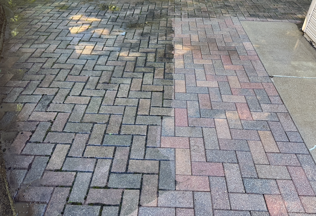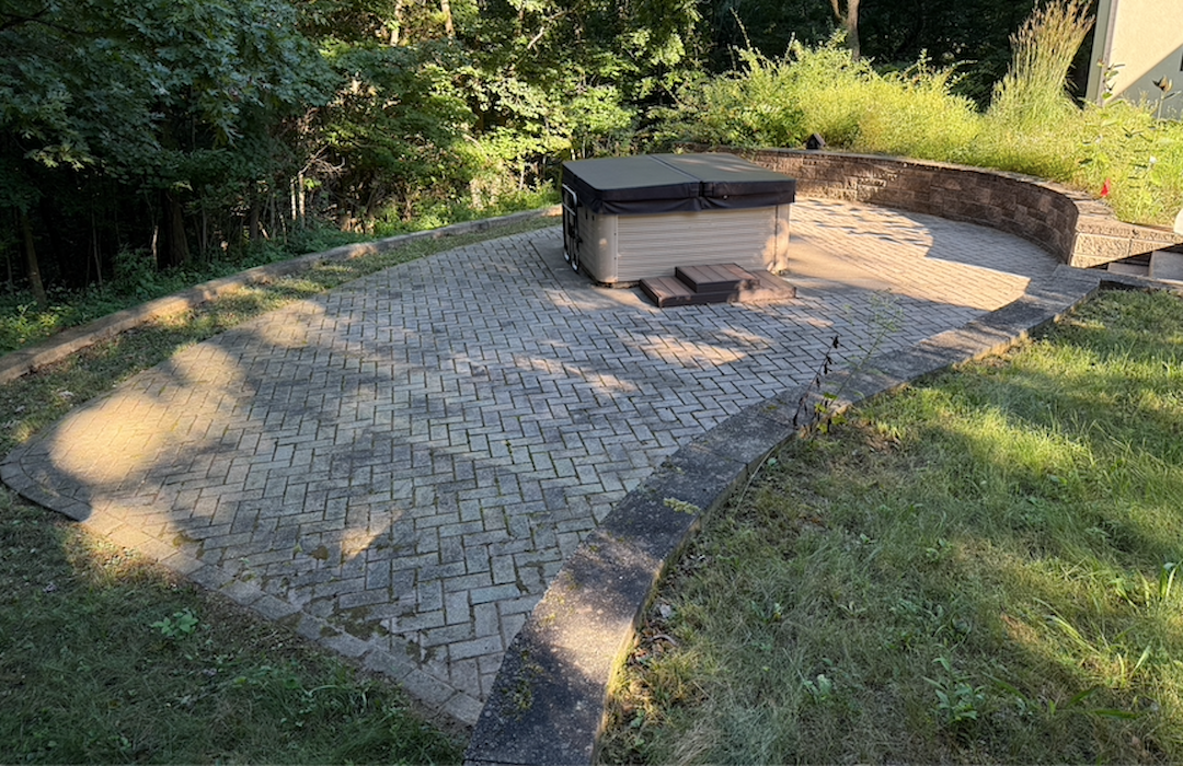 These areas were installed about five years ago in rural Metamora and had not had any work done to them since. Over that time, the sand in between the pavers had lost its strength and started to fall out of the joints creating holes and organic growth to occur both on the surface and in between the pavers of patio and the driveway. This exterior cleaning project included removing all the sand out from between the pavers to make way for the new polymeric sand that was installed prior to sealing the surface to make the driveway look brand new!